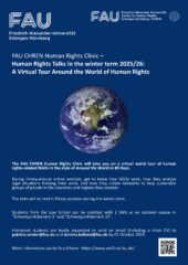 The Human Rights Talks is a project of the FAU CHREN Human Rights Clinic in the winter term 2025/26, which will take you on a virtual world tour of human rights related NGOs in the style of “Around the World in 80 Days”. Non-governmental organisations (NGOs) working in the field of human rights are independent, non-profit entities that operate at local, national, or international levels with the primary aim of promoting, protecting, and advancing human rights. They engage in activities such as monitoring and reporting abuses, advocating for legal and policy reforms, raising public awareness, providing support and protection to victims, and fostering compliance with international human rights standards. During ninety-minute online sessions, you will explore the world of NGOs and engage in discussions with experts from civil society practice in different world regions. Get to know how NGOs work, how they analyse legal situations framing their work and how they create networks to help vulnerable groups of people in the countries and regions they operate. The Human Rights Talks will give you an impression of the diverse human rights issues in the different regions of the world – they also represent an opportunity for global networking and finding out about what the world of defending human rights has to offer as a career perspective. The Talks will be held in Friday sessions during the winter term (Zoom or, in exceptional cases, in-person).